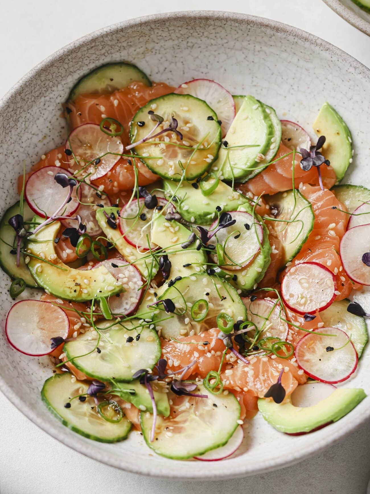 - Add the sliced avocado, radish and cucumber around or on top of the salmon.